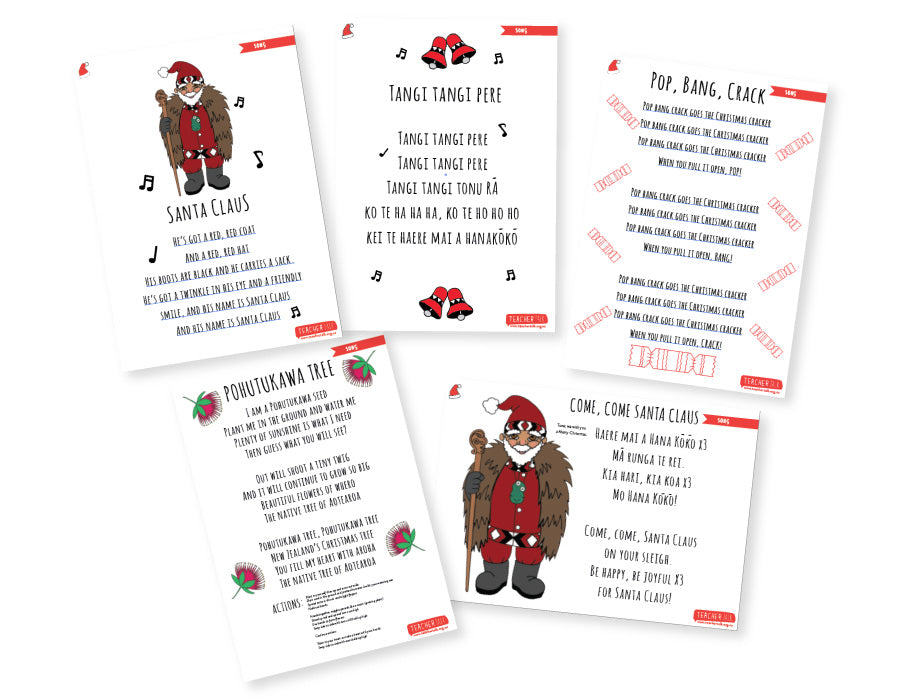 Download or 5 x Christmas Song Pack A3, te reo Māori & English, laminate pop up on the wall to sing together with the children. A great one for mat times during the festive season!