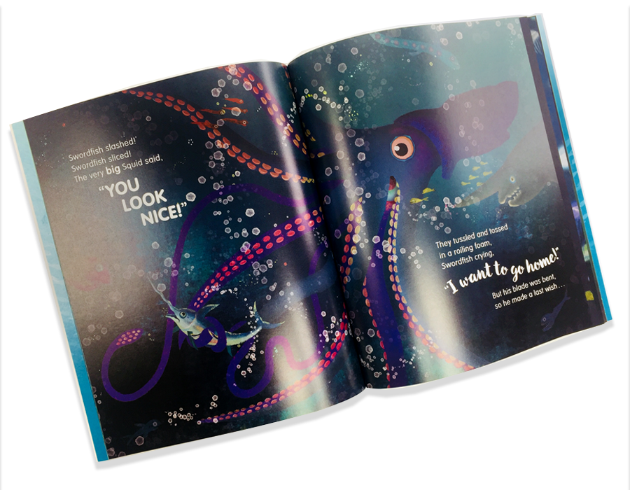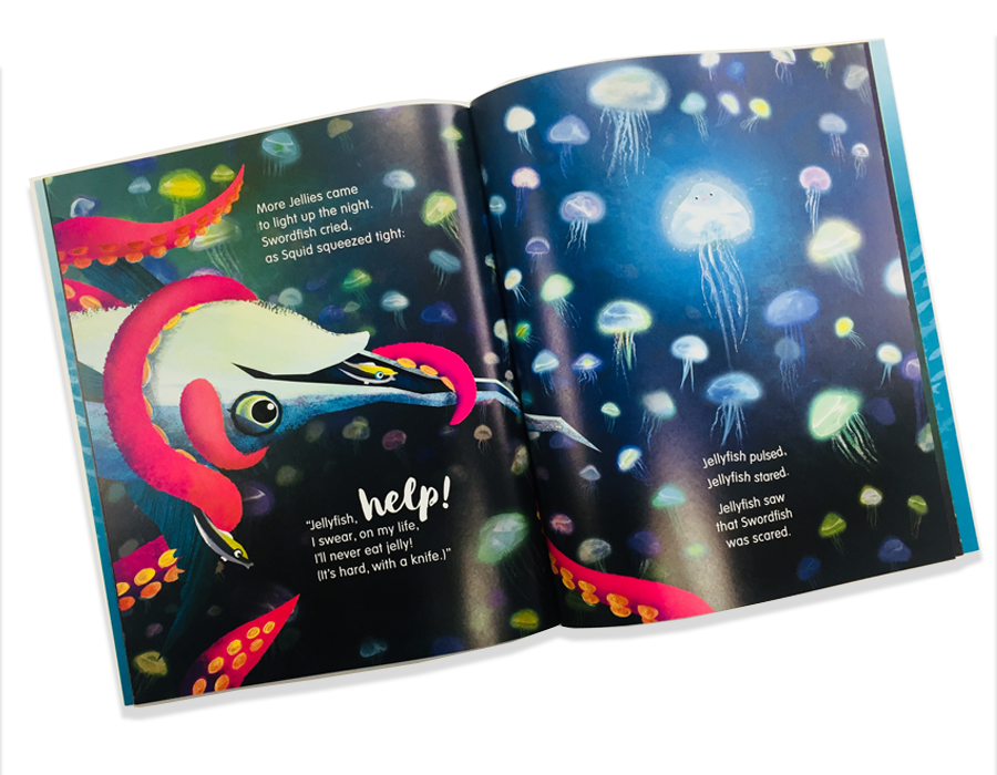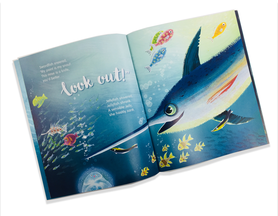Jellyfish is quietly crooning in the shallows, when knife-nosed Swordfish swooshes, races and chases her, down, down, down, deep into the dark blue sea.