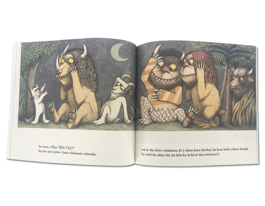 By Maurice Sendack. The award-winning much-loved children’s picture book Where the Wild Things Are is now translated into te reo Māori. With the same lively, creative illustrations as the original book, the te reo Māori version retains the simplicity and imagination of Maurice Sendak’s story, capturing Max’s feisty character, the magic of the adventure and ‘wild rumpus’, and the pleasure of things returning to normal.