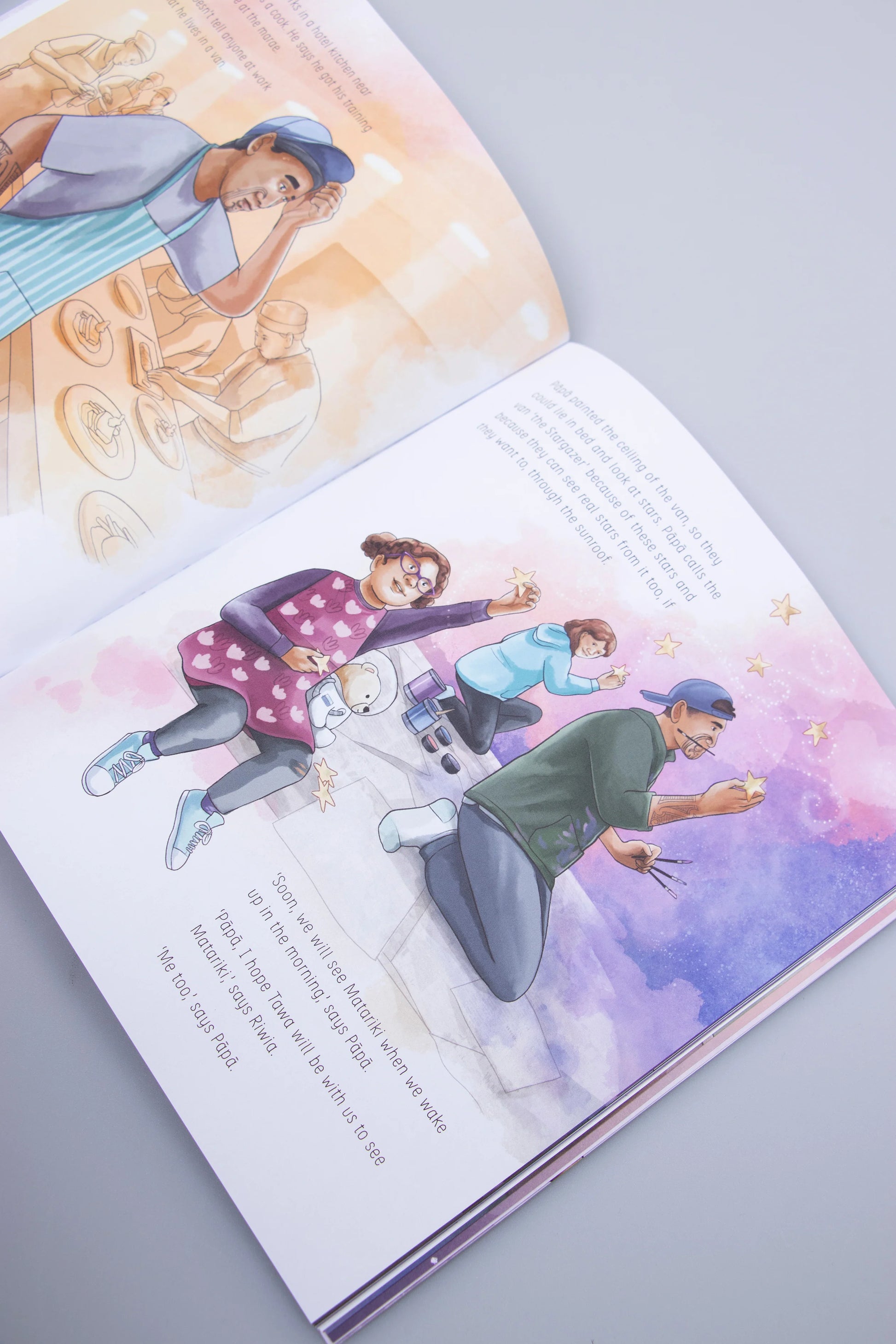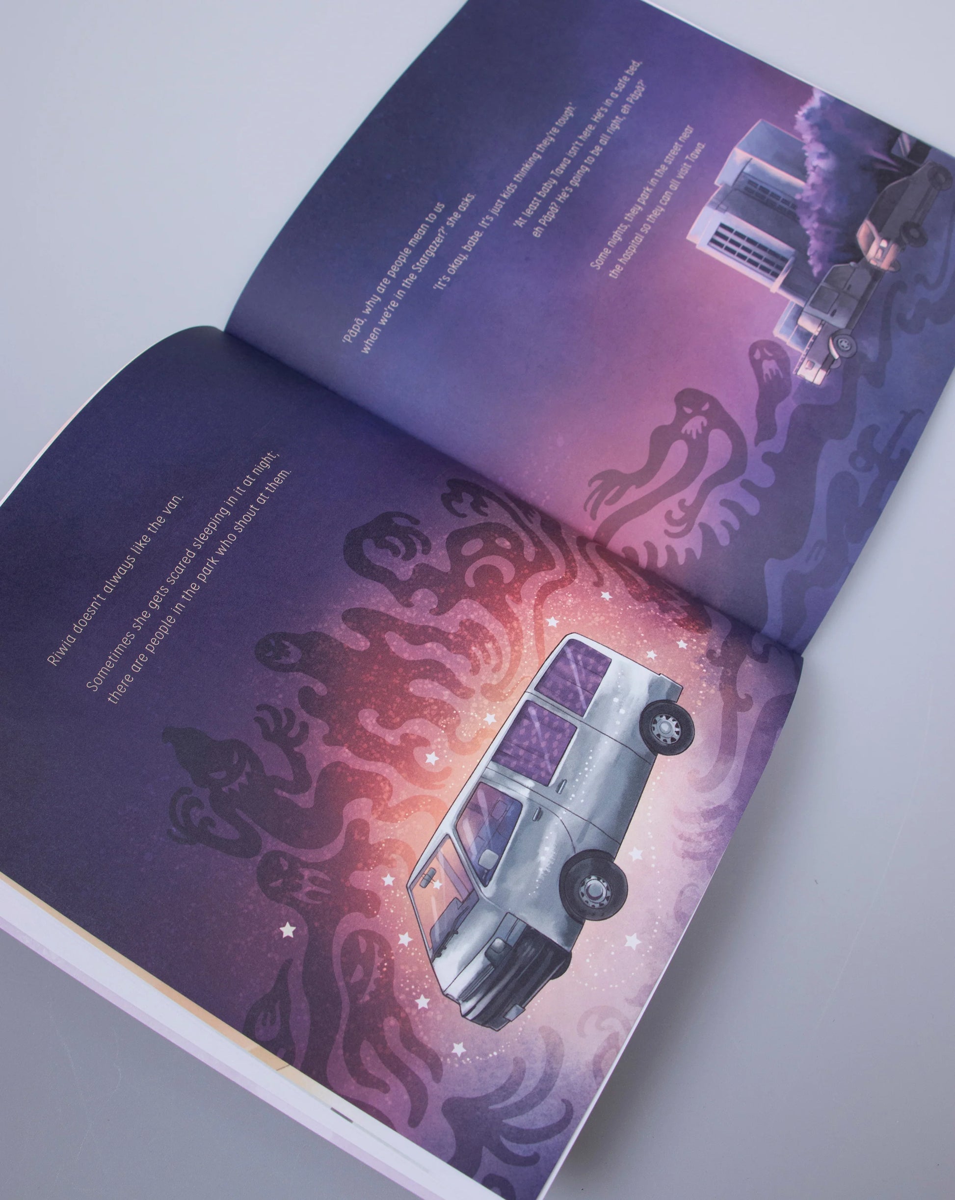 Since he was born, Riwia’s baby brother, Tawa, has been in Auckland Hospital, and his family has come to stay in Auckland. While Riwia goes to school and Dad works as a cook, Mum stays with Tawa. Their Aunty Sue’s house is full, and renting is expensive, so Riwia and her parents live in a van, the Stargazer, in the park. Sometimes it’s scary at night when people shout at them in the park, but the weekend is good when they go to Aunty Sue’s and Dad cooks a boil-up and they all have a shower. But Tawa is getting sicker, and he dies. The family travels back to Te Teko, taking Tawa to the marae for his tangi and burial. Riwia learns about the journey Tawa’s spirit will make to farewell Aotearoa and join the waka of stars that gathers the spirits of the dead. And at Matariki, the family remembers Tawa and gathers to see his spirit burning brightly as a star.