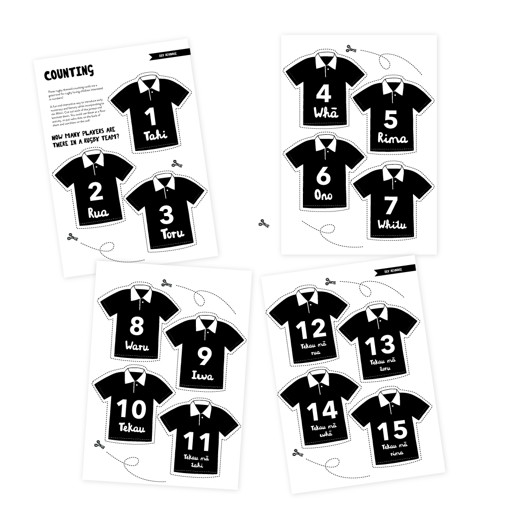 A fun and interactive way to introduce early numeracy and literacy while incorporating te reo Maori. Cut out each of the jerseys and laminate them. You could use these as a floor activity, or put velco dots on the back of them and use them on the wall.
