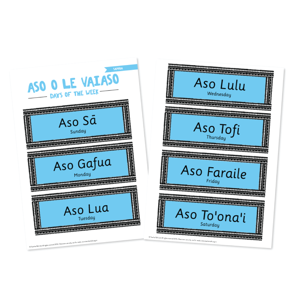 Learn the Days of the week in Samoan, print, laminate and pop around your environment!