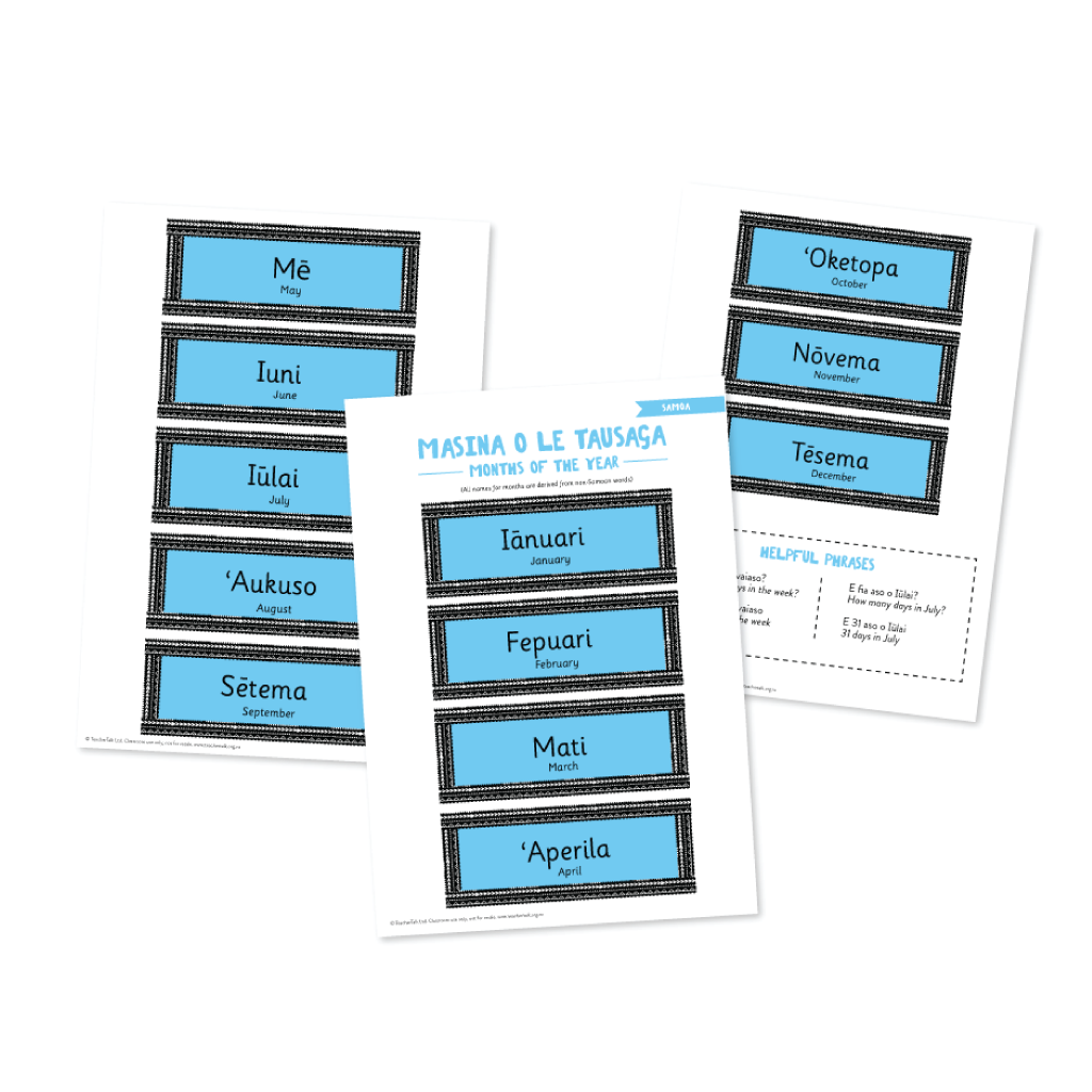 Months of the year labels for your environment in Samoan and english. Print, laminate, cut out and pop around your environment.