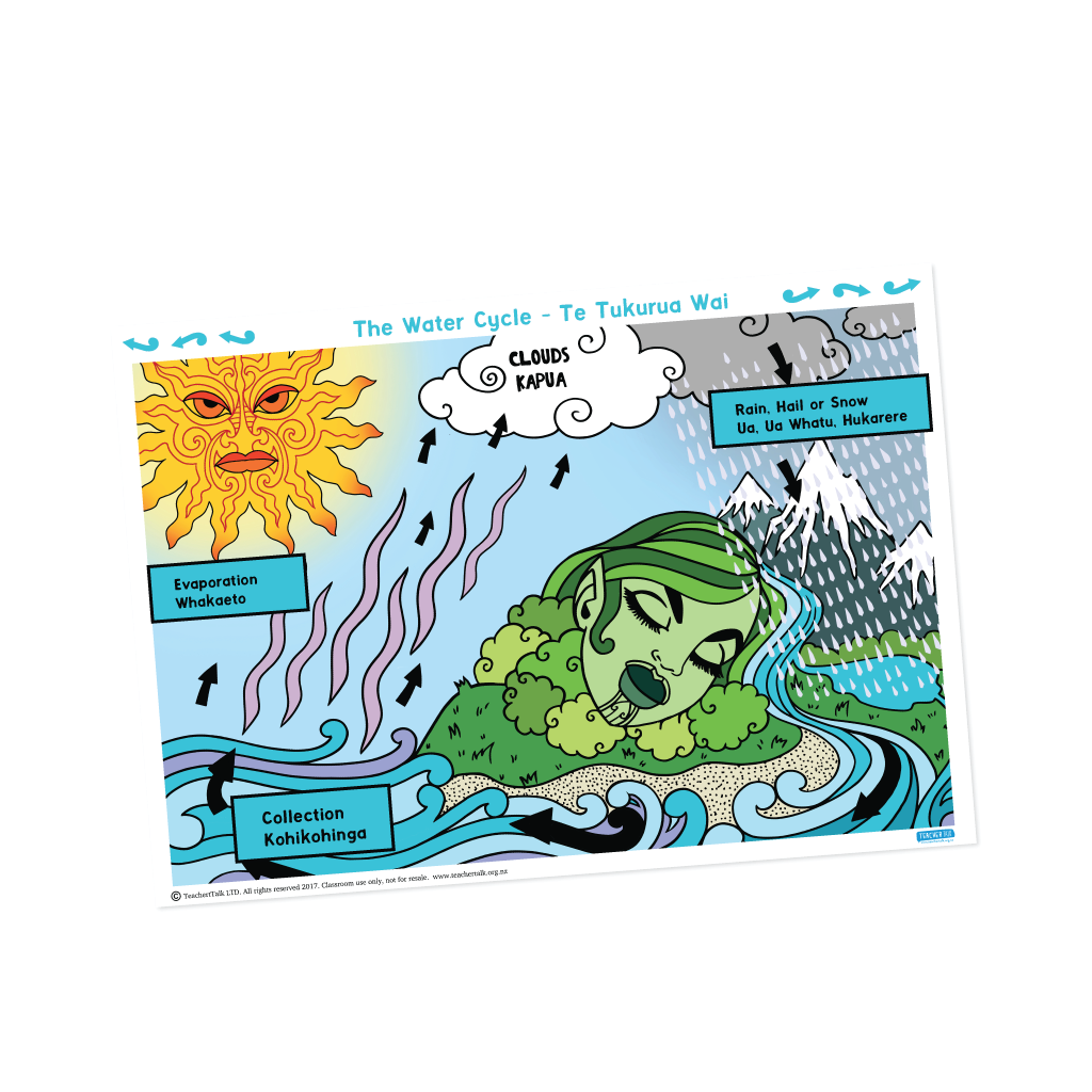 Download this A3 Poster which explains the water cycle showing the continuous movement of water within Papatūānuku (Earth) and the atmosphere.