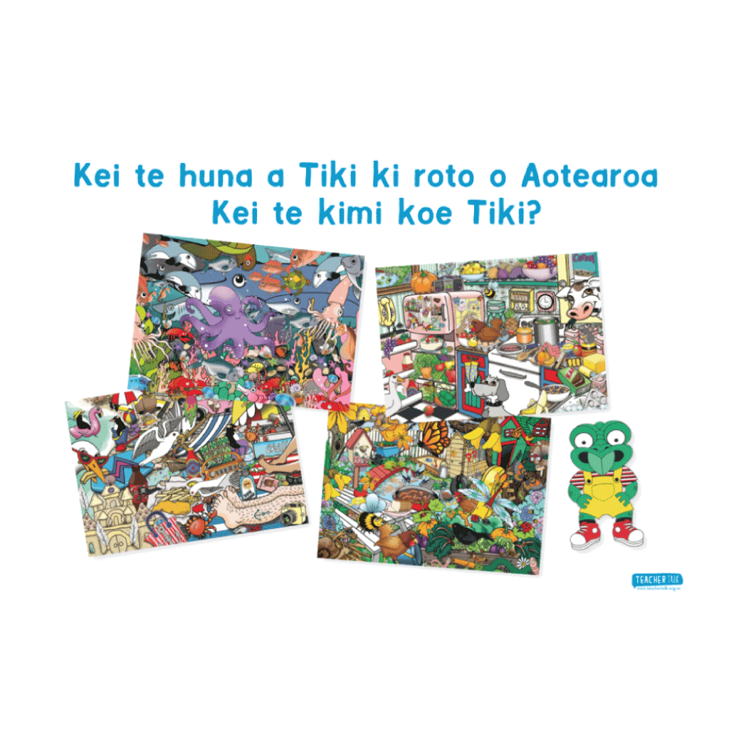 Tiki in Aotearoa is a fun tabletop activity that helps little ones learn some common words & phrases in te Reo Māori! Kei te huna a Tiki ki roto o Aotearoa... Kei te kimi koe Tiki? Tiki is hiding somewhere in Aotearoa, can you find Tiki? Comes with 4 x vibrantly illustrated & elaborate NZ Scenes. Includes At the Beach, Under the Sea, In the Garden & In the Kitchen. Also comes with 4 x word prompt pages of different animals and items to find in each picture!