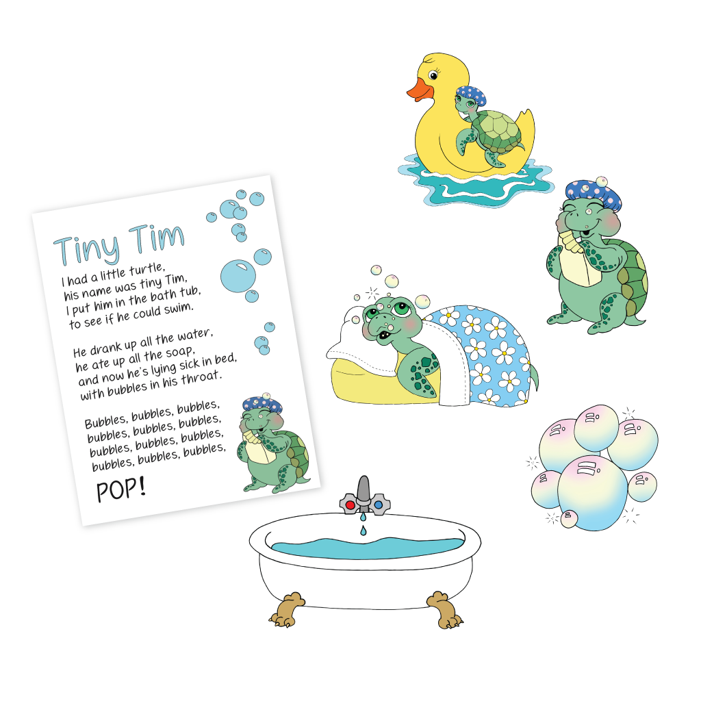 I had a little turtle... His name was Tiny Tim. A great sing-a-long that children love! Sing this infamous song using these awesome illustrations of each character turned into magnets.